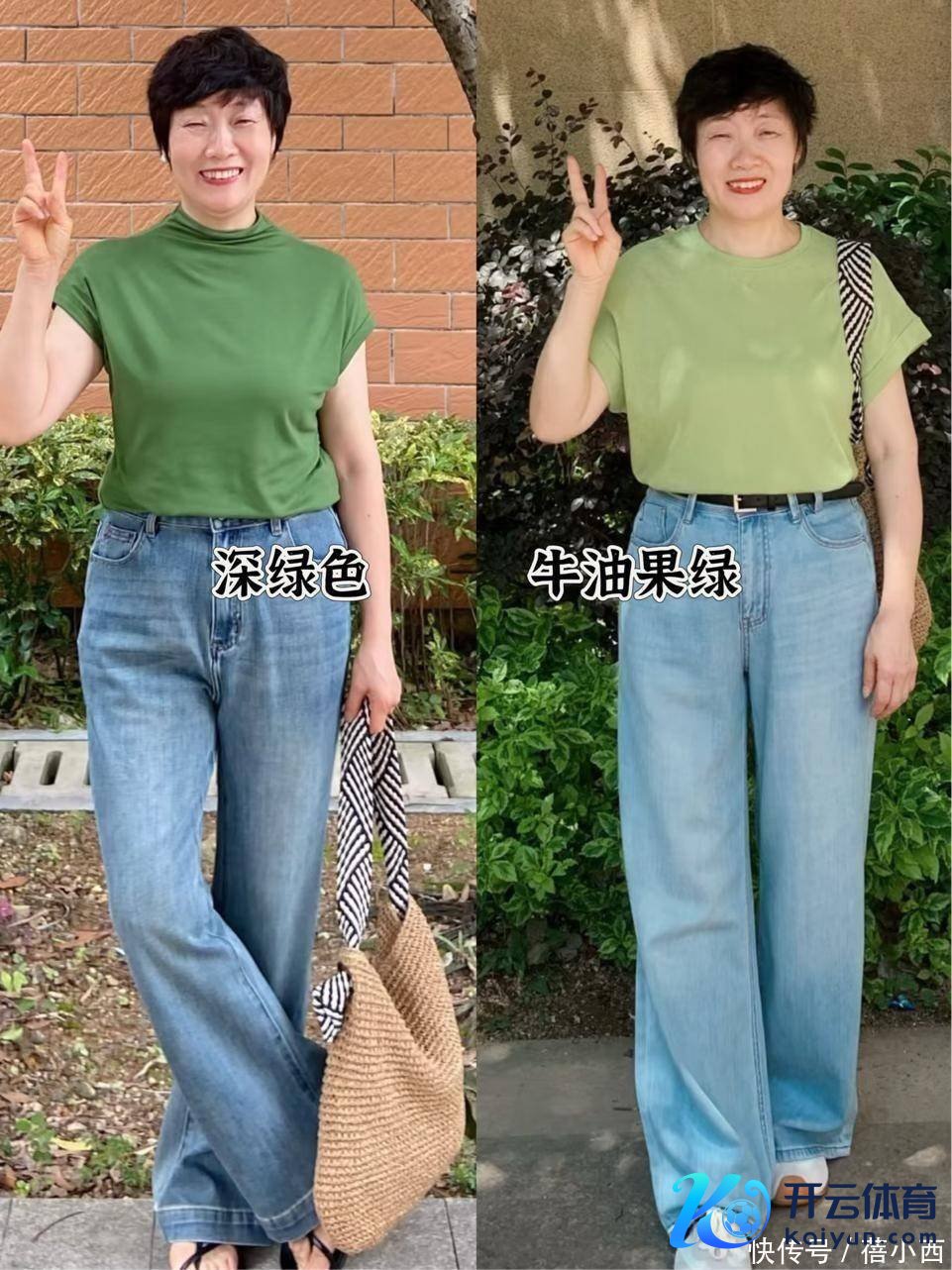 搭配的时辰,不错用短上衣衔尾,比如这种绿色短袖搭配高腰蓝色牛仔阔腿裤,配色逸群绝伦,搭配利落有型,绝顶稳当微胖发福的中年女性。
