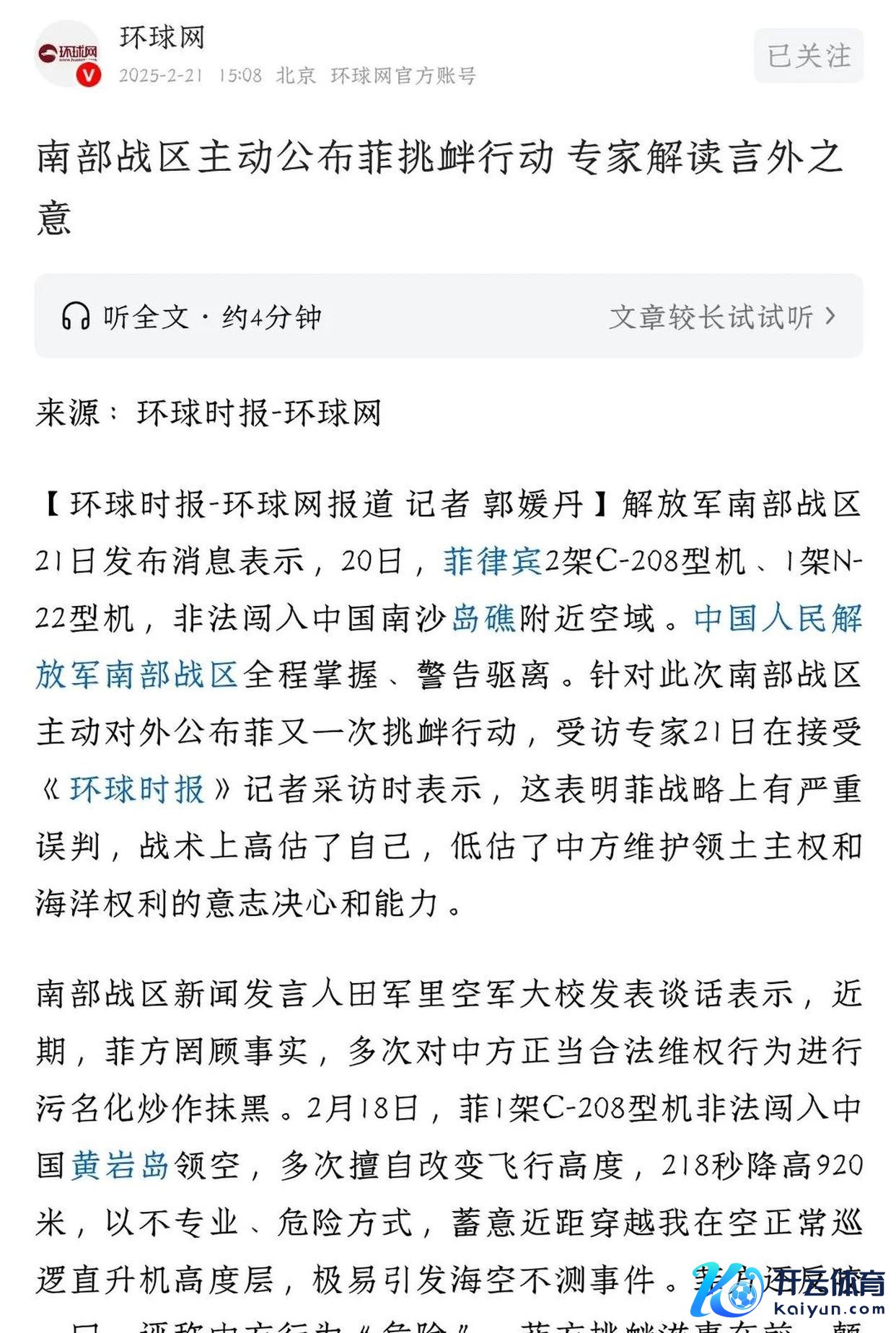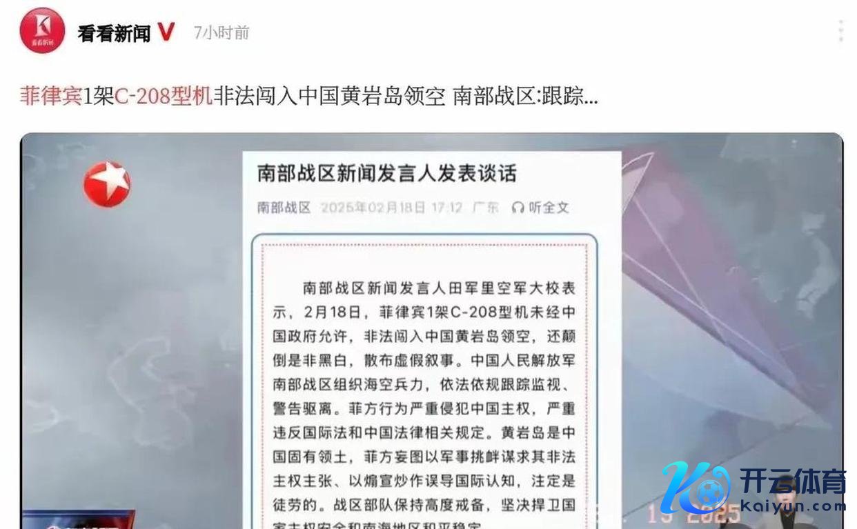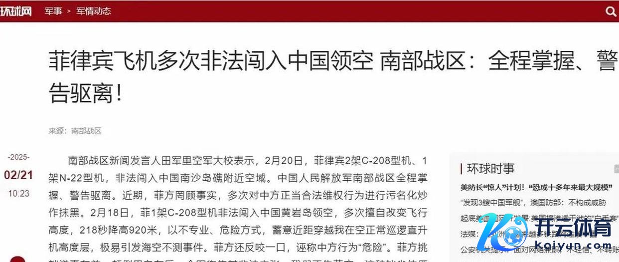 南部战区新闻发言东谈主田军里空军大校走漏,2月20日,菲律宾的两架C-208和一架N-22飞机作恶插手中国南沙岛的空域。中国东谈主民自若军南部战区对此情况进行了全程监控,并对其进行了告诫和驱离。当菲律宾飞机飞入南海上空时,南部战区赶紧派出战机进行全程追踪并发出告诫。现在云开体育,这三架菲律宾飞机已撤出我国领空。本人再次告诫菲律宾,近期屡次无视事实私行闯入南沙岛,归国后更是特意进行坏心炒作。