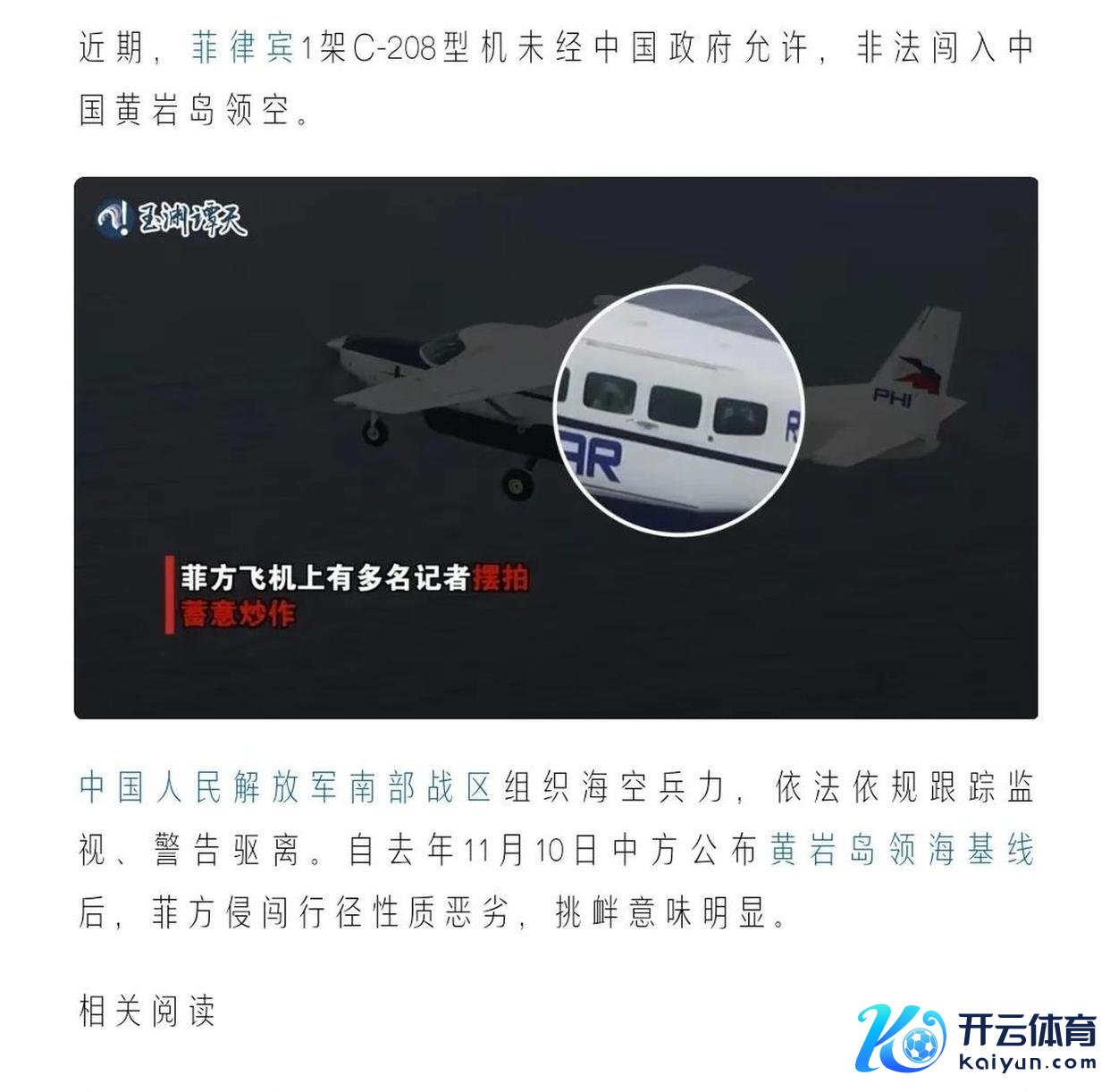 中方在应酬媒体上发布音信,2月18日菲律宾一架C-208型飞机作恶插手中国黄岩岛空域,并带着女记者准备拍照。接到论说后,本人战斗机立即起飞,对其进行追踪和呼喊驱离,但菲律宾飞机对此漫无谓心,反复作念出危境动作,大致改造飞行高度。在仅218秒的时代内,菲律宾飞机俄顷责难920米,特意在本人巡查直升机的高度层穿越。简陋来说,菲律宾军机从高空极速下落,冲向本人军用直升机,以欠妥面貌进行接近,极有可能激励海空事故。菲律宾方面还反过来攻讦中方行为“危境”。2月18日刚往日,2月20日又出现情况,南部战区新闻发言东谈主田军里空军大校示意,菲律宾两架C-208型机和一架N-22型机再次作恶入侵中国南沙岛礁隔壁空域,自若军南部战区全程掌控并进行了告诫驱离。