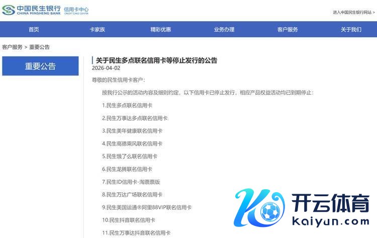 中国民生银行信用卡中心4月2日文牍,民生多点联名信用卡、民生高德乘风联名信用卡等11款信用卡居品已罢手刊行,相应居品职权活动均已到期罢手。