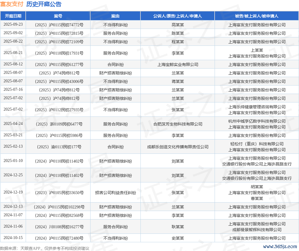 案号:(2025)沪0115民初61277号审理法院:上海市浦东新区东说念主民法院案由:条约纠纷当事东说念主信息: 原告/上诉东说念主:上海宝鲸实业有限公司 被告/被上诉东说念主:上海富友支付职业股份有限公司开庭日历:2025年8月12日把柄统计,近一年内以上海富友支付职业股份有限公司为当事东说念主的历史开庭公告有24则,其中案由为“职业条约纠纷”的公告以8则居首,其次为“财产挫伤补偿纠纷”有8则,“不当得利纠纷”有5则。历史开庭公告(前20条)如下: